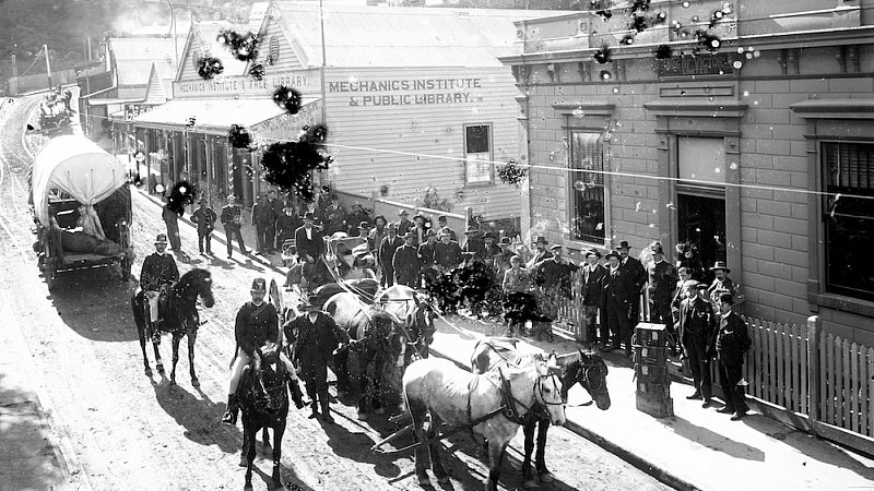 The Bank of Victoria was the grandest bank in Walhalla during the gold-era. This is the gold escort about to depart. This building was removed to Moe after the closure of the mines however the brick bank vault remains.